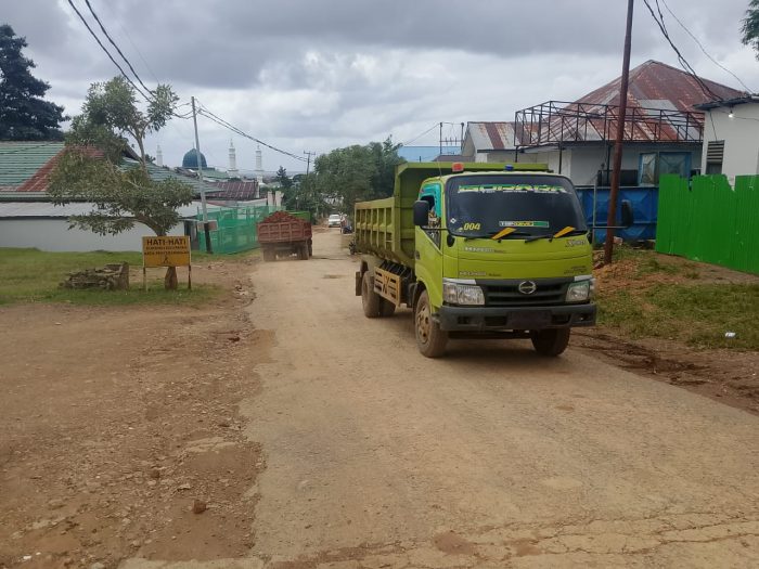 Aktivitas truk pengangkut tanah proyek pembangunan Rumah Sakit Umum Daerah (RSUD) Sanana, Kabupaten Kepulauan Sula, Maluku Utara menyebabkan jalan di wilayah Desa Falahu, Kecamatan Sanana berdebu.