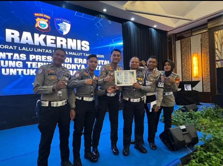 Piagam penghargaan tersebut diserahkan Direktur Lalu Lintas Polda Maluku Utara, Kombes Pol Doni Hermawan Kasat Lantas Polres Kepulauan Sula, Ipda A.R Taufiq Habsi dalam acara Rakernis Direktorat Lalu Lintas Polda Maluku Utara, Selasa (21/10/2025).